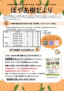 ぼやあ樹だより@2025年10月号 10月の広報誌が完成致しました。 今月は、要介護度4・5の方を対象とした、食費割引キャンペーンを実施しております! 広報誌「ぼやあ樹だより」 食費割引キャンペーン 10・11・12月 今月も、ご利用に関わるみなさんの「希望をカタチに」すべく、 スタッフ一同、日々邁進してまいります。 entry2298ツイート entry2298シェアする entry2298送る
