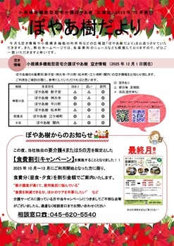 ぼやあ樹だより@2025年12月号 12月の広報誌が完成致しました。 今月も要介護度4・5の方を対象とした、食費割引キャンペーンを実施しております! 広報誌「ぼやあ樹だより」 食費割引キャンペーン 10・11・12月 今月も、ご利用に関わるみなさんの「希望をカタチに」すべく、 スタッフ一同、日々邁進してまいります。 entry2337ツイート entry2337シェアする entry2337送る