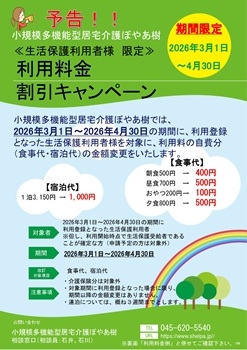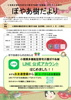 ぼやあ樹だより@2026年2月号 2月の広報誌が完成致しました。 小規模多機能型居宅介護 ぼやあ樹のLINE公式アカウントを開設しました。 ぜひ、お気軽にご登録ください。 次回予告、当社独自の生活保護受給者の方を限定とした 【利用料金 割引キャンペーン】を実施する予定です!! 広報誌「ぼやあ樹だより」 生保キャンペーン予告 3・4月 今月も、ご利用に関わるみなさんの「希望をカタチに」すべく、 スタッフ一同、日々邁進してまいります。 entry2386ツイート entry2386シェアする entry2386送る