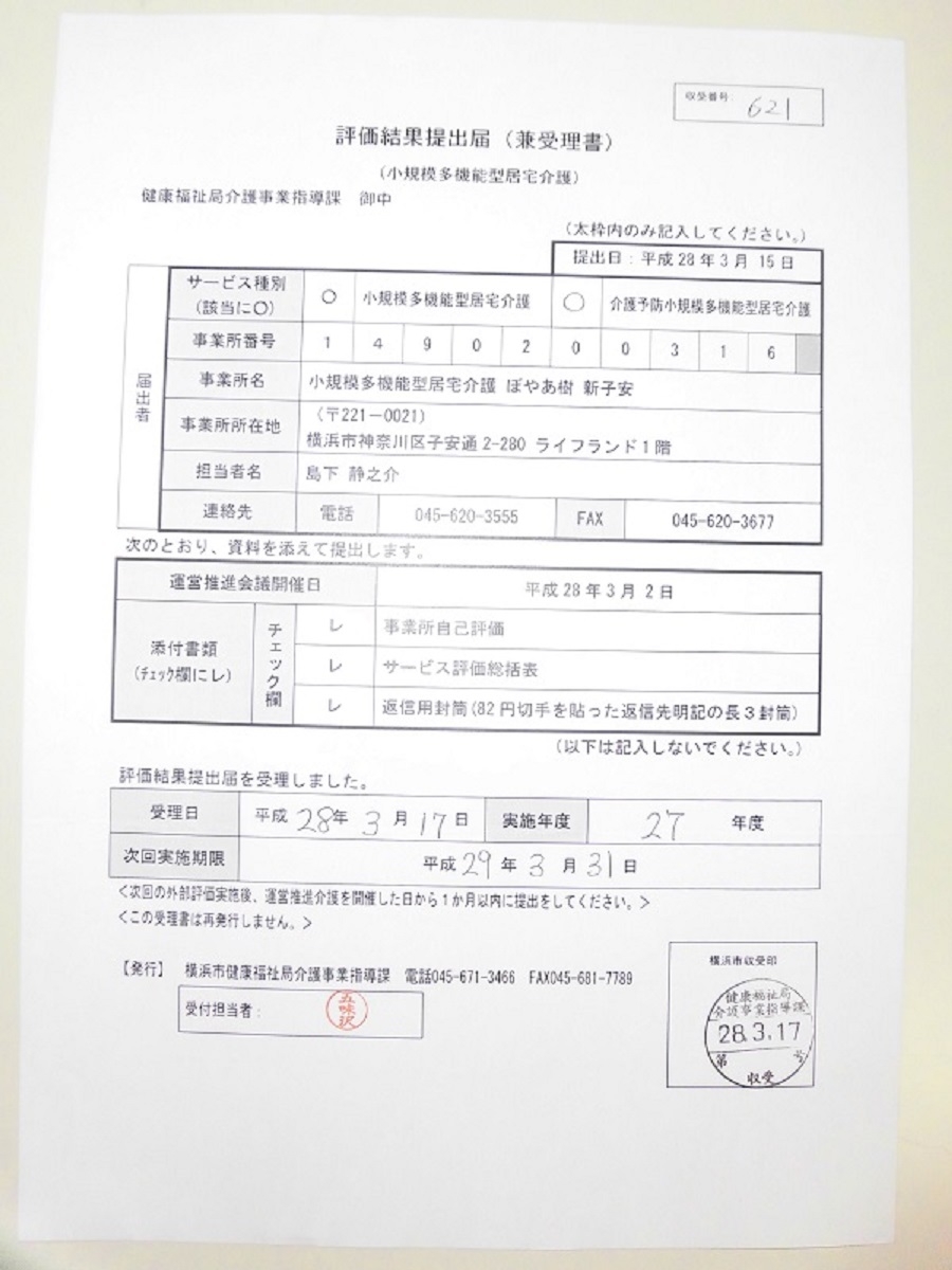 小規模多機能ぼやあ樹、全事業所 外部評価実施! 小規模多機能ぼやあ樹神大寺、新子安、ポートサイド全事業所にて、外部評価を実施致しました。 事業所の自己評価から、地域や家族とのかかわりや防災・災害対策など、多方面にわたり評価を行い、事業所の総合的なシステムやサービスの見直しを行うきっかけとなりました。 今回の結果を参考に、今後の活動に活かしてまいりたいと存じますので、引き続きのご指導ご鞭燵を賜りますようお願い申し上げます。 entry372ツイート entry372シェアする entry372送る